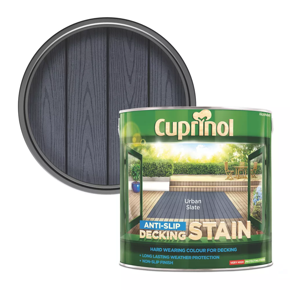 2.5Ltr. Tough, weather-resistant, water-based decking stain. Offers a rich, semi-transparent colour and durable finish. Double-action formula features invisible anti-slip microbeads for a safer surface. Contains an algicide to help protect the film surface from green algae and mould growth. Apply by brush only.